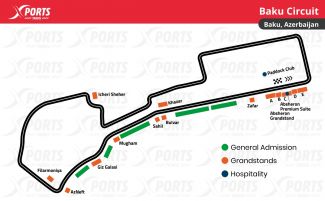Baku City Circuit: First Grand Prix: 2016/ Circuit length:6.003 km / Race distance: 306.049 km / Number of turns: 51 / Curves: 20 / Lap record: 1:43.009 / Charles Leclerc (2019)