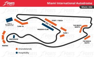 Miami International Autodrome: Primer Gran Premio: 2022 / Longitud del recorrido: 5,412 km / Distancia carrera: 306.587 km / Número de vueltas: 57 / Curvas: 19 / Record de pista: 1:29.746 / Lando Norris (2025)
