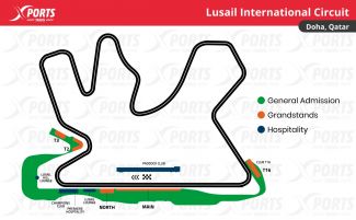 Lusail International Circuit: Primer Gran Premio: 2004 / Longitud del circuito: 5,38 km / Distancia de la carrera: 306,66 km / Número de vueltas: 57 / Curvas: 16 / Récord de la pista: 1:23.196 / Max Verstappen (2021)